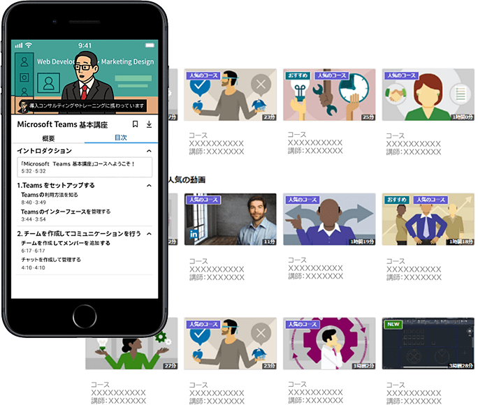 動画は1本平均3分程度、移動中や休憩中などいつでもどこでも様々なデバイスから受講可能