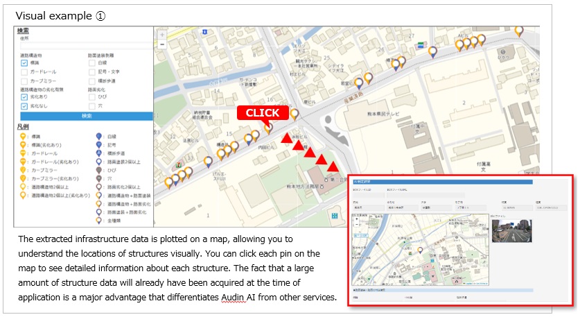 Audin AI is a cloud service for evaluating infrastructure deterioration by combining drive recorder data with structure identification and deterioration diagnosis technology and by standardizing public infrastructure registry management and AI-based inspection accuracy.