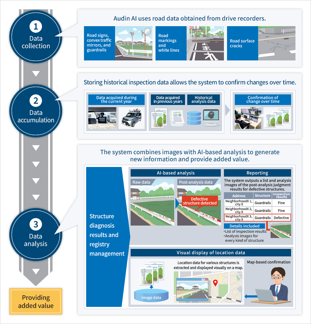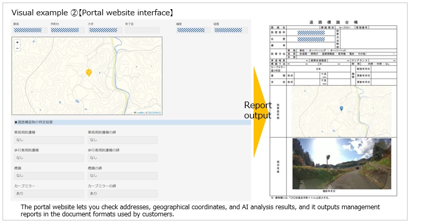 Public infrastructure image data acquired from drive recorders is combined with deterioration diagnosis AI to provide digital data for infrastructure-related structure registries and to provide reports on deterioration analysis results through a portal website.