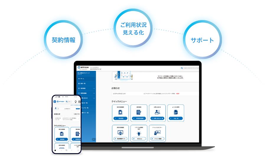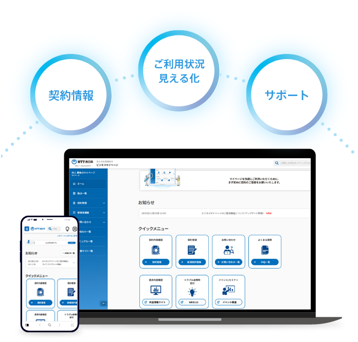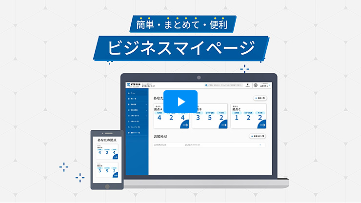 NTT西日本ビジネスマイページ誕生!フレッツ光・ひかり電話等のご契約照会や、各サービスのマニュアル・FAQ、BizClipなどのお役立ち情報サイト等の閲覧が可能になりました。